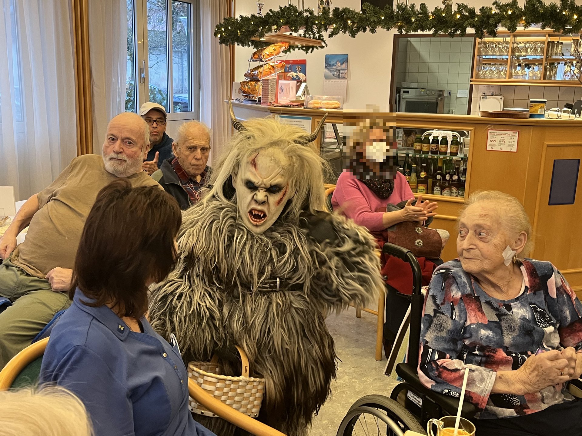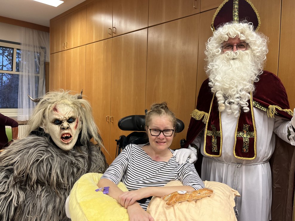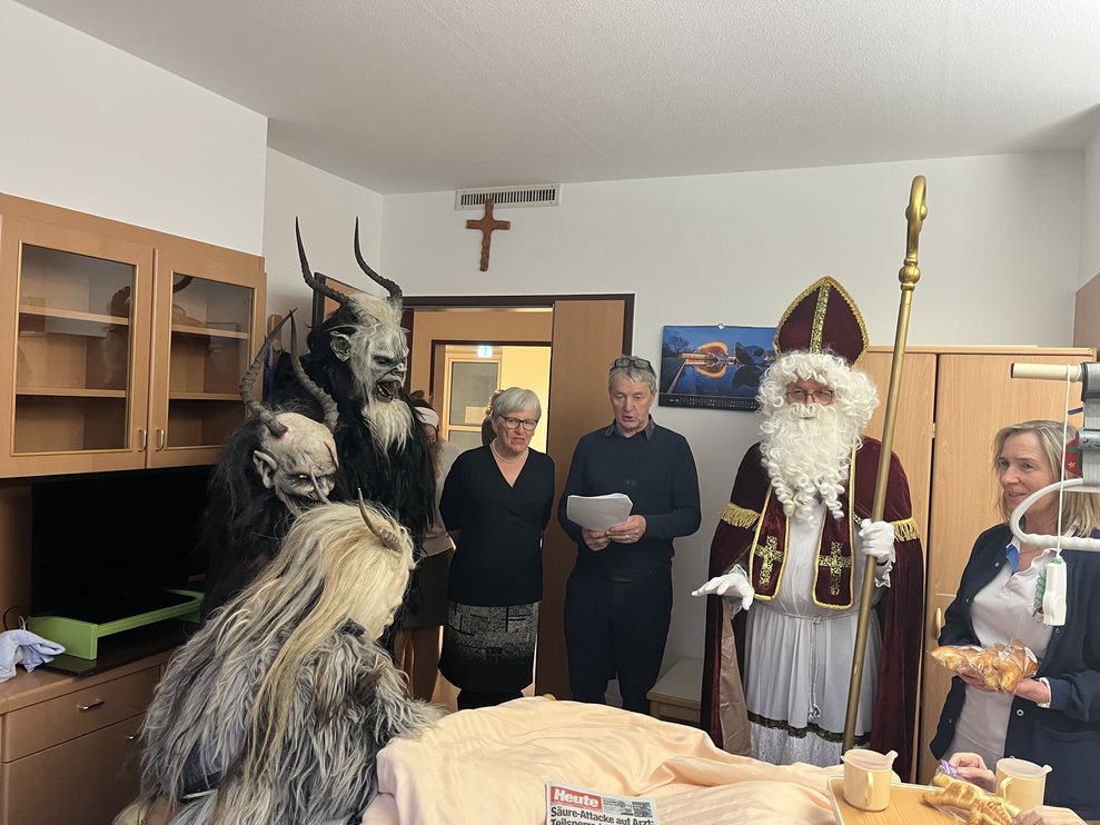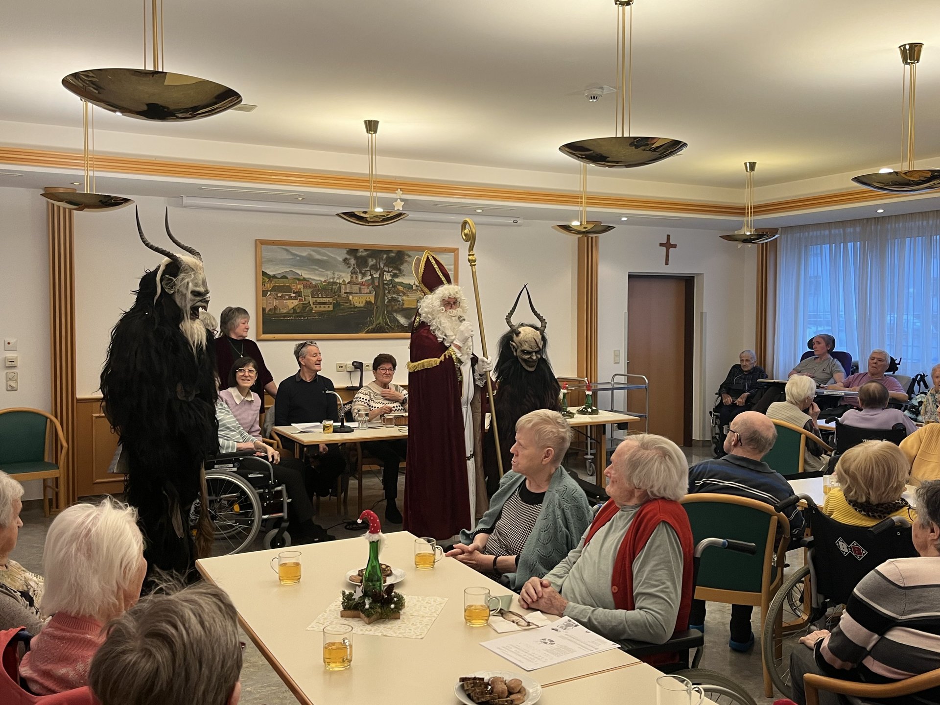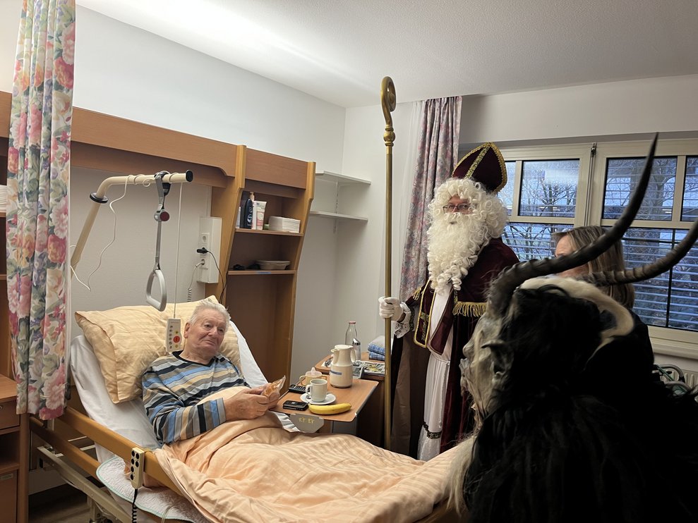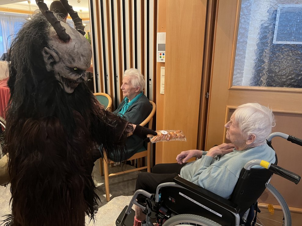 Für unsere Bewohnerinnen und Bewohner hatte der Nikolaus Briochegebäck dabei, seine schaurigen Begleiter verteilten Schokolade. Umrahmt wurde die Feier vom Ehrenamtschor, der mit alten und neuen Weihnachtslieder zum Mitsingen animierte.