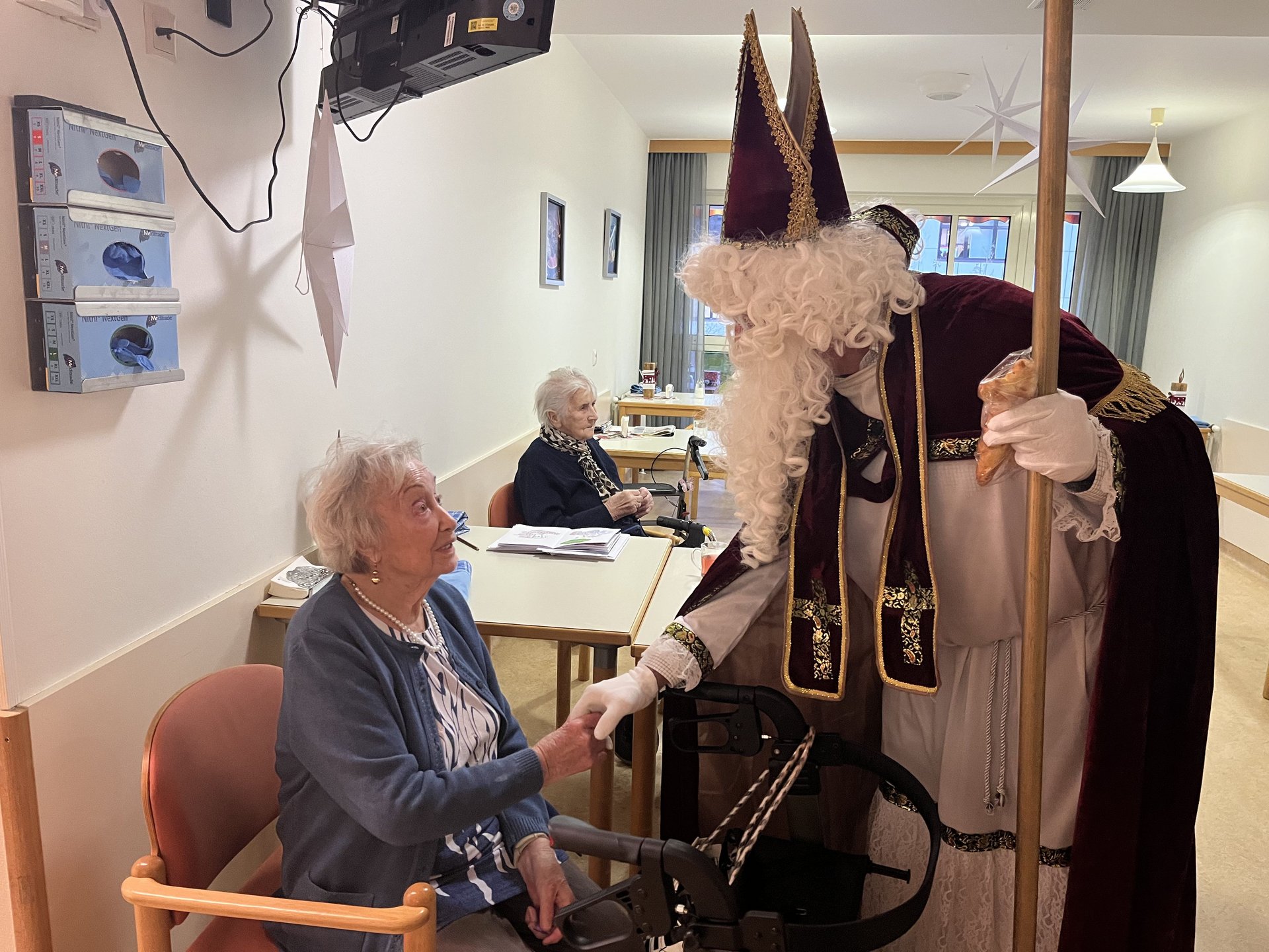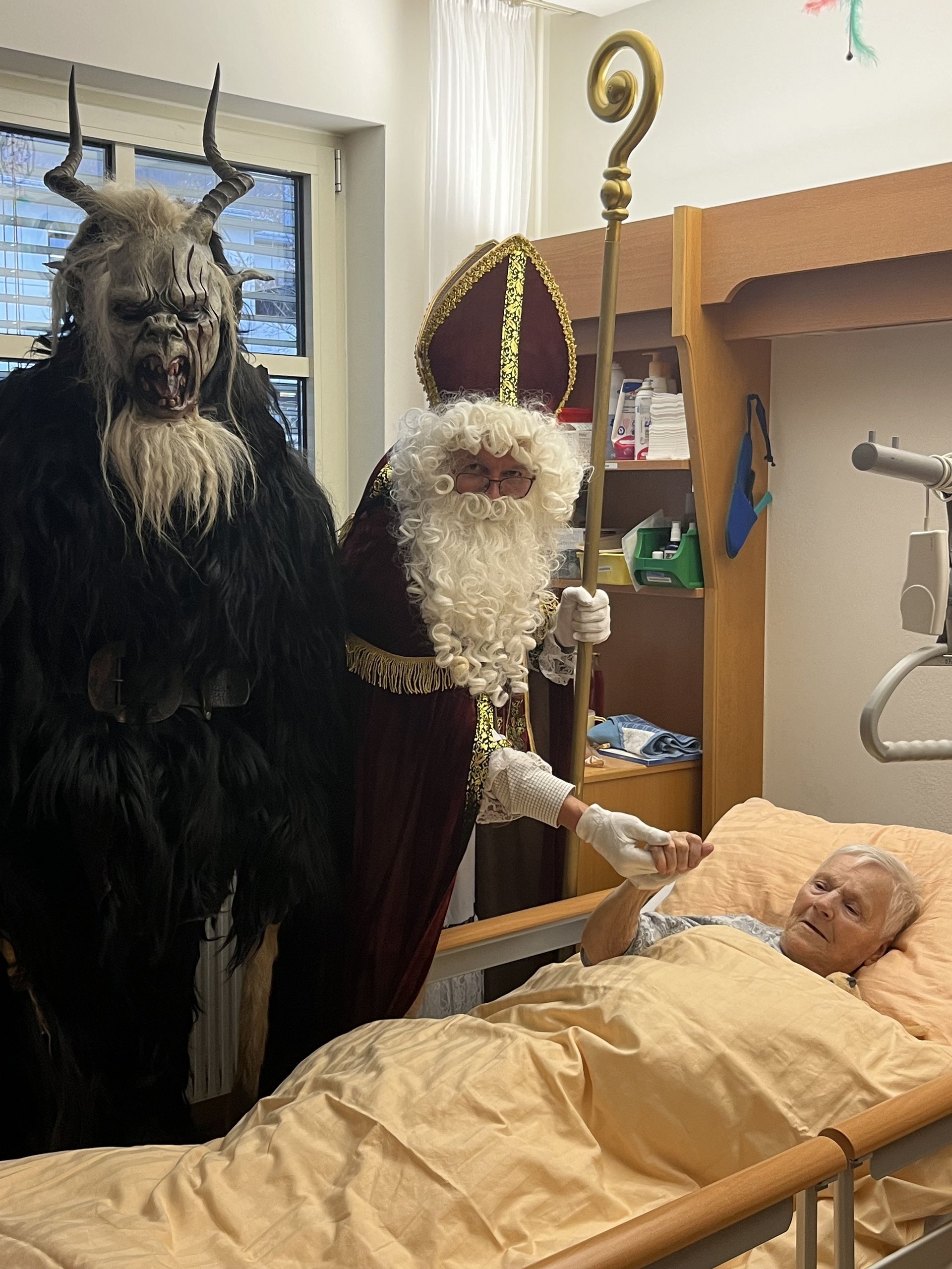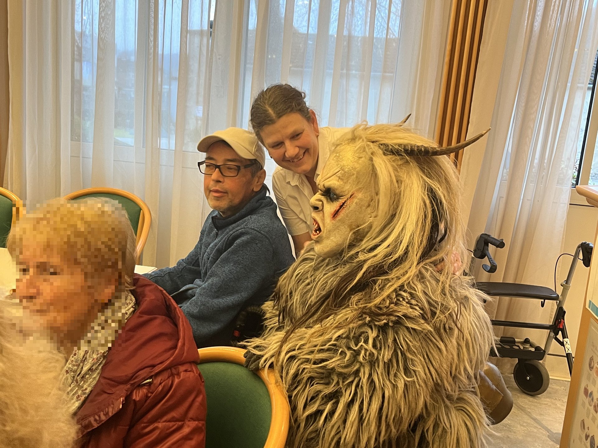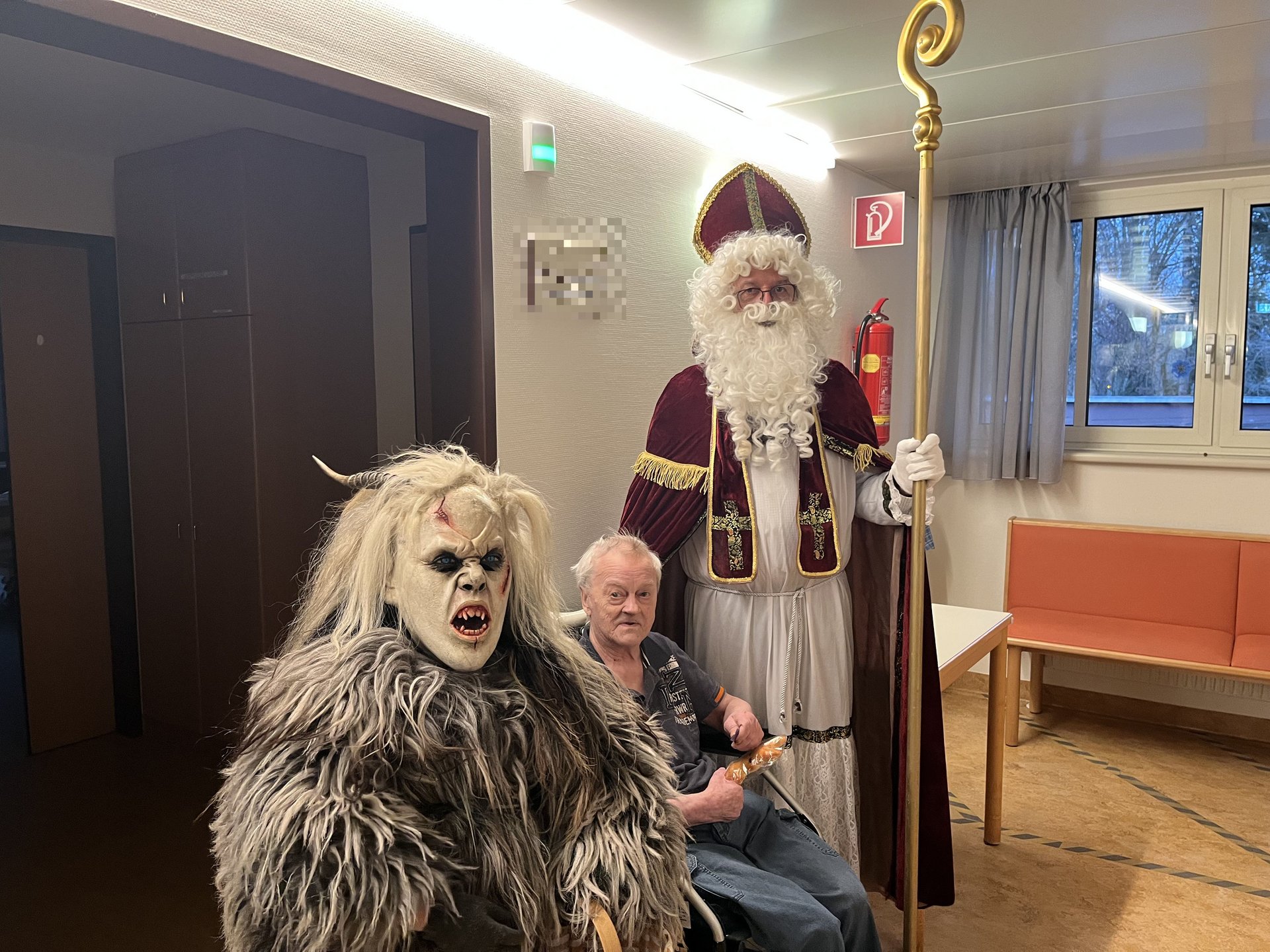 Für unsere Bewohnerinnen und Bewohner hatte der Nikolaus Briochegebäck dabei, seine schaurigen Begleiter verteilten Schokolade. Umrahmt wurde die Feier vom Ehrenamtschor, der mit alten und neuen Weihnachtslieder zum Mitsingen animierte.