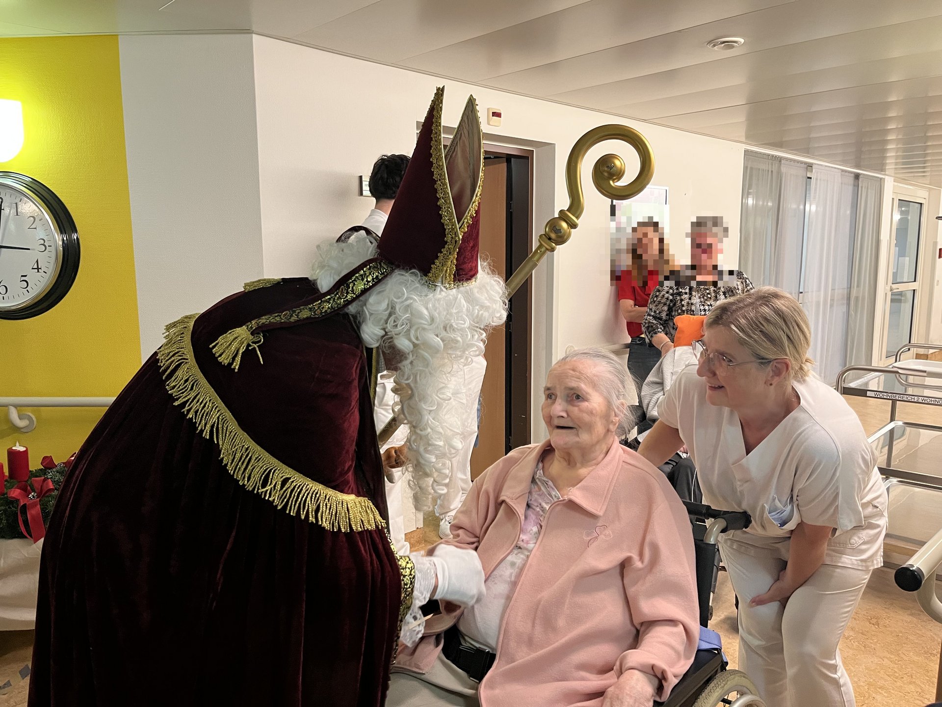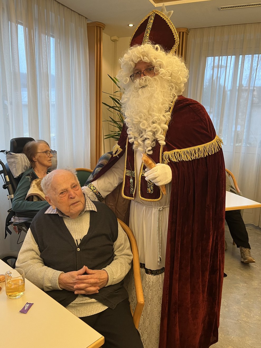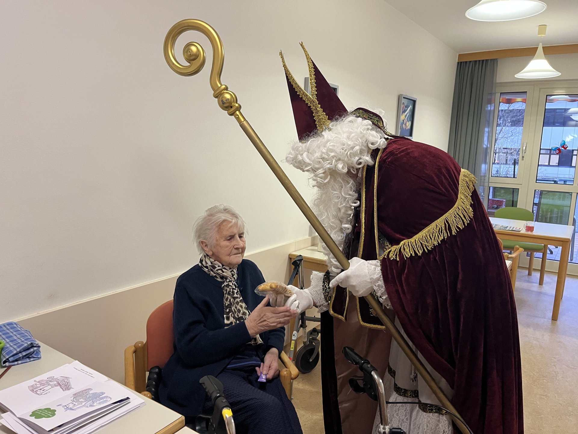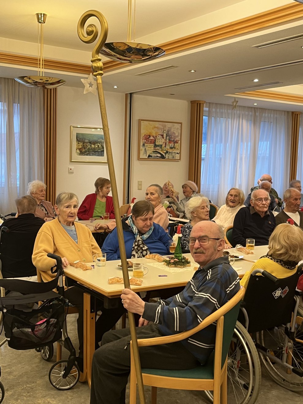 Für unsere Bewohnerinnen und Bewohner hatte der Nikolaus Briochegebäck dabei, seine schaurigen Begleiter verteilten Schokolade. Umrahmt wurde die Feier vom Ehrenamtschor, der mit alten und neuen Weihnachtslieder zum Mitsingen animierte.