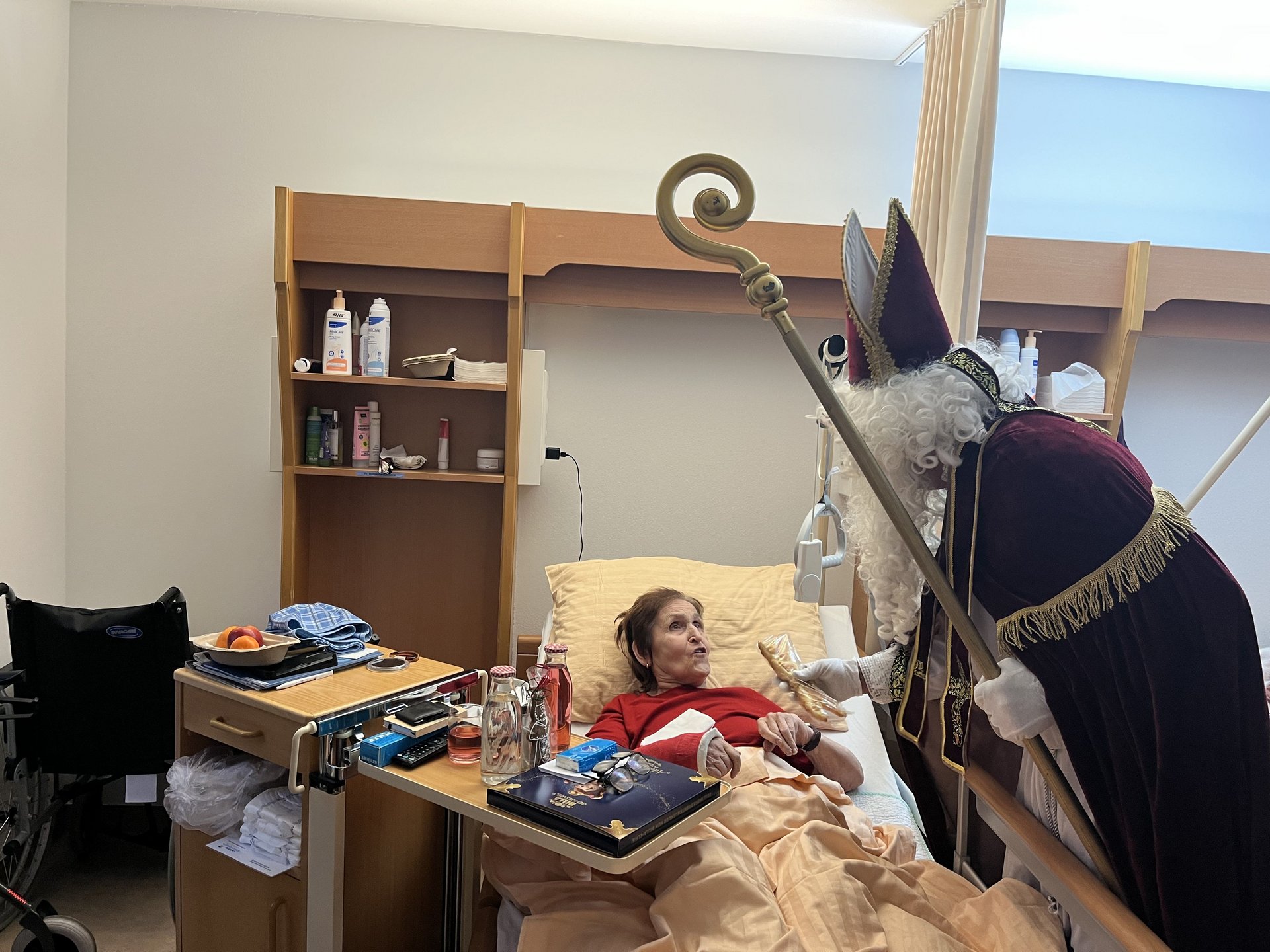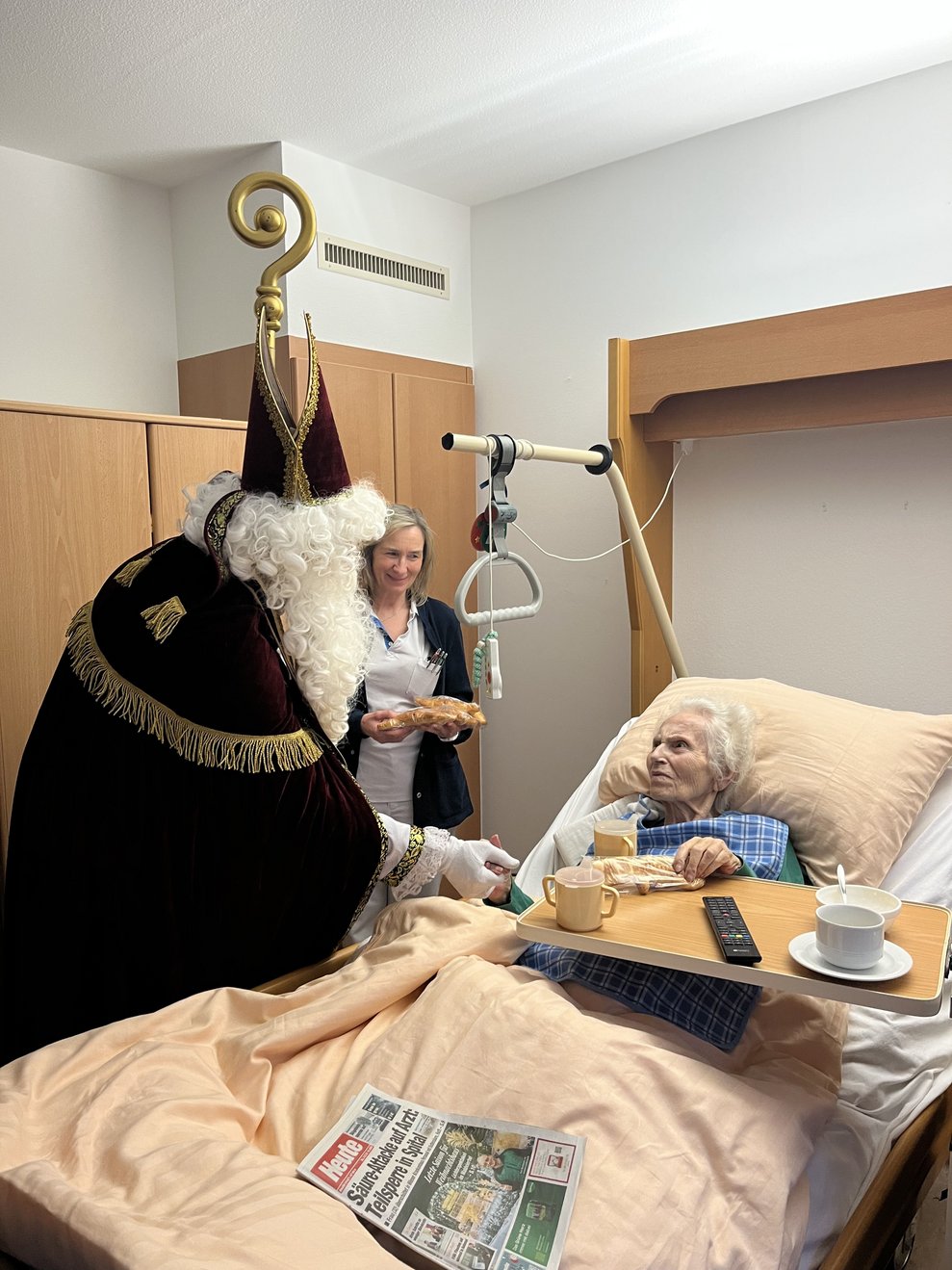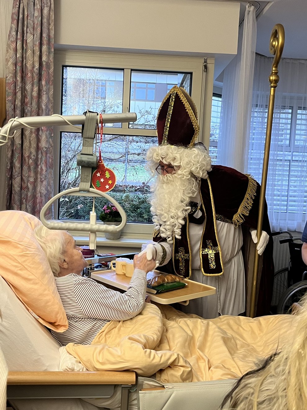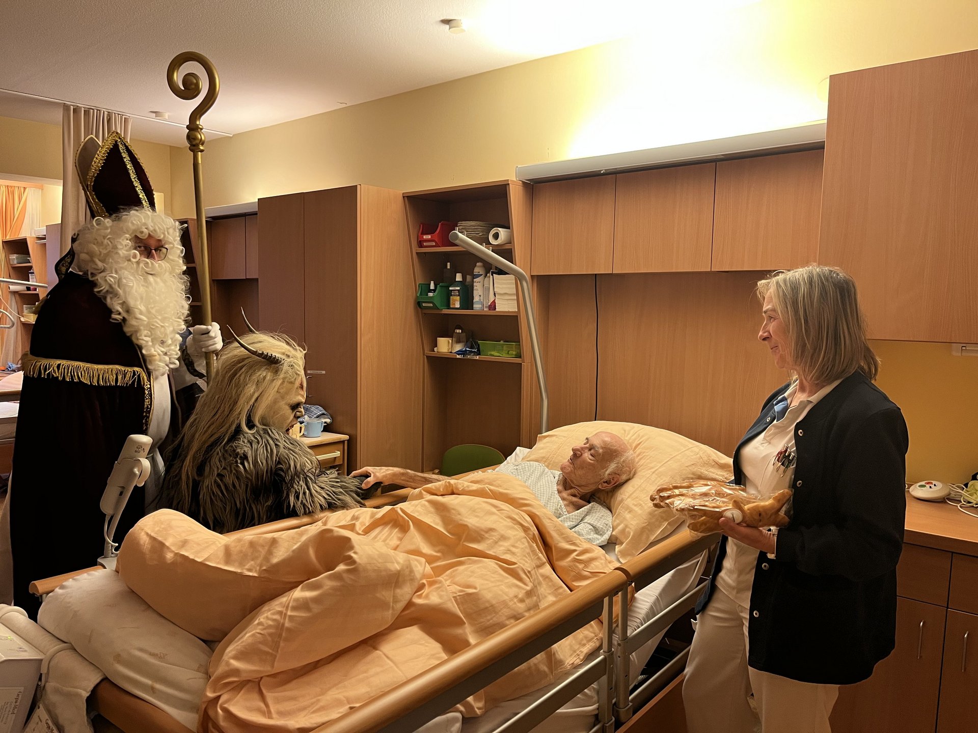 Für unsere Bewohnerinnen und Bewohner hatte der Nikolaus Briochegebäck dabei, seine schaurigen Begleiter verteilten Schokolade. Umrahmt wurde die Feier vom Ehrenamtschor, der mit alten und neuen Weihnachtslieder zum Mitsingen animierte.
