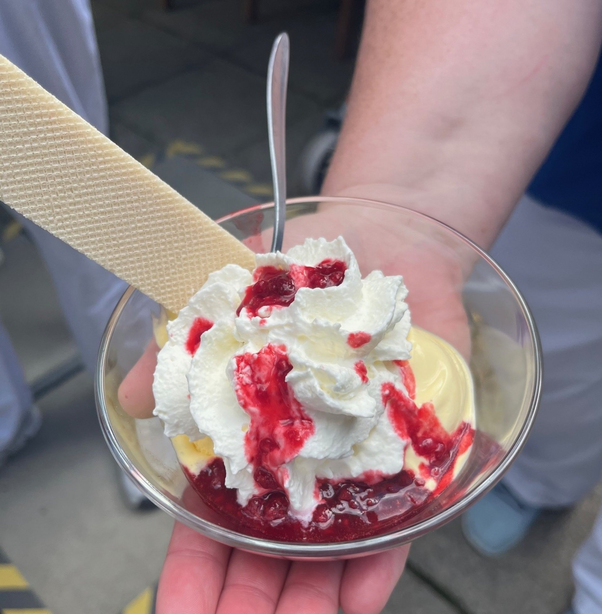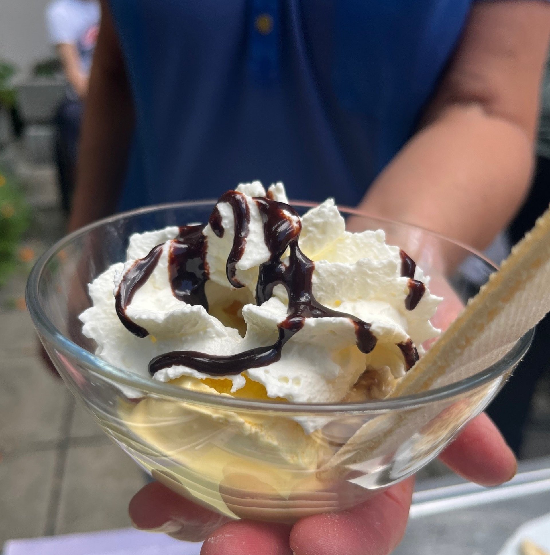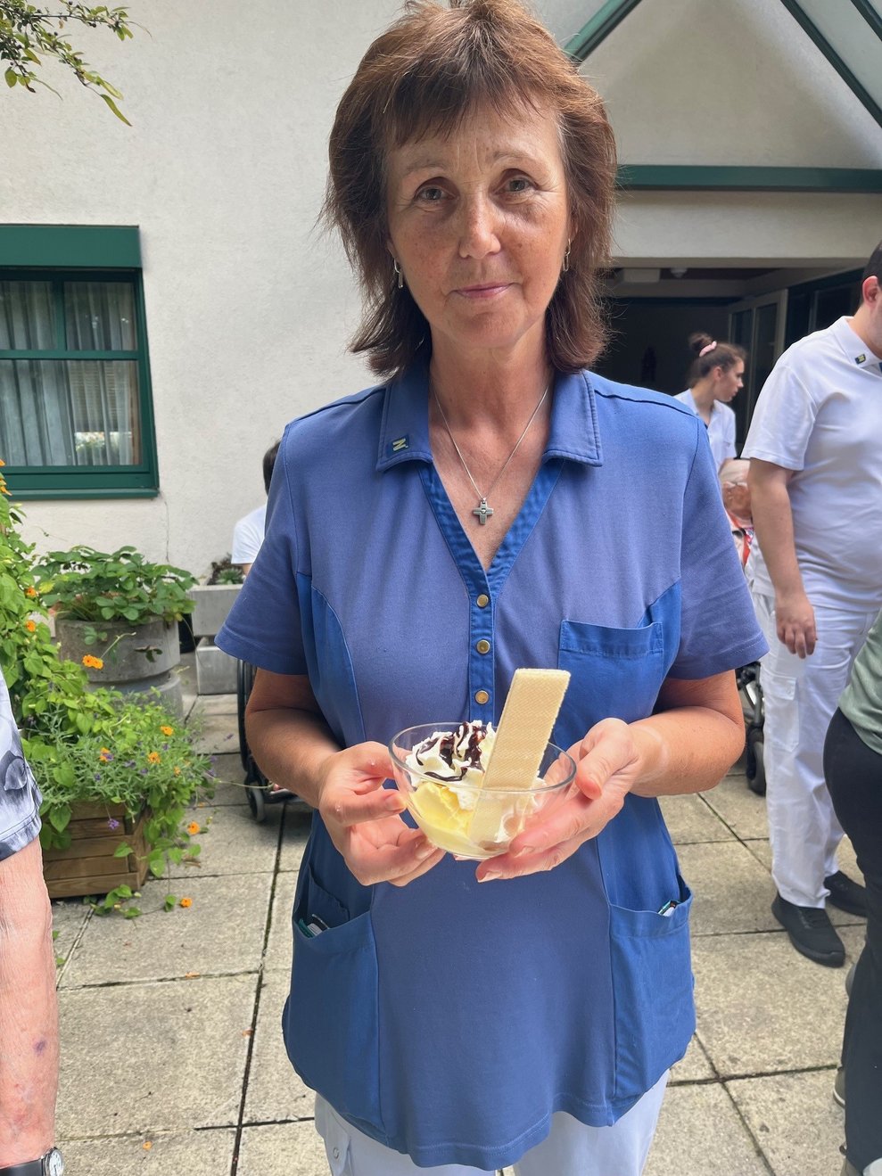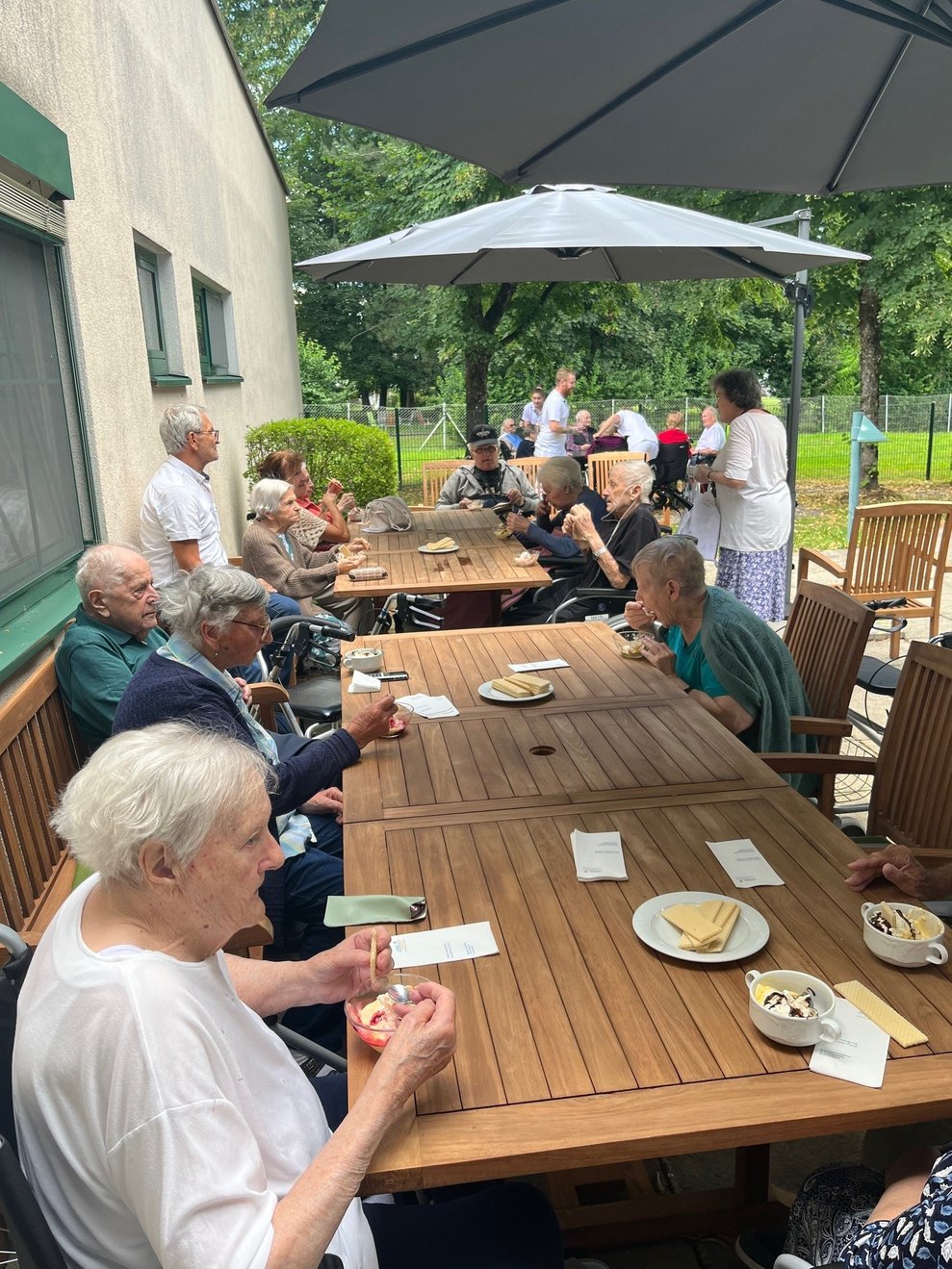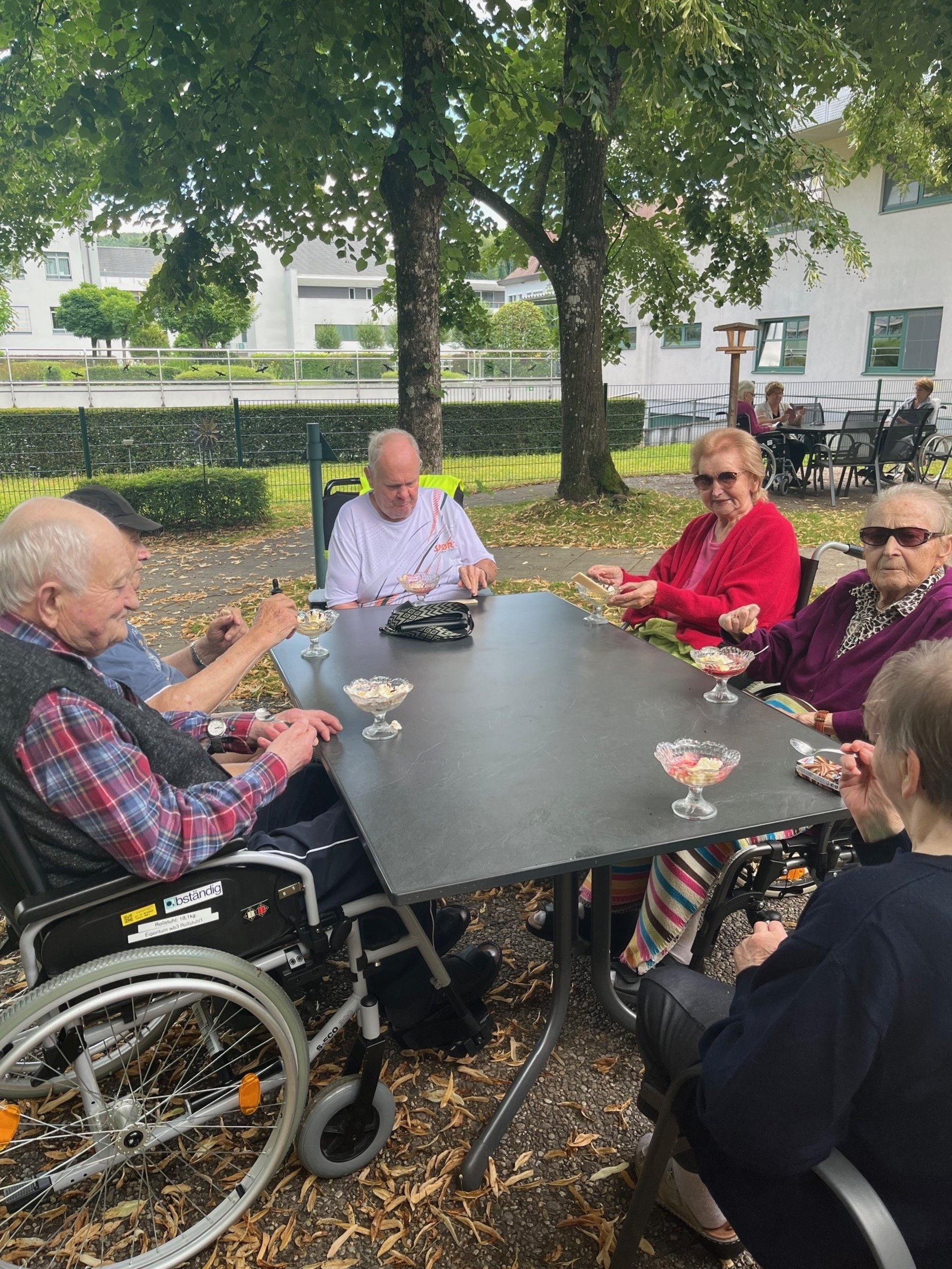 Bei sonnigem Wetter wurde im Garten des PBZ Waidhofen/Ybbs ein Eisnachmittag für unsere Bewohnerinnen und Bewohner veranstaltet. Die Besucherinnen und Besucher genossen Heiße Liebe, Bananensplit oder gemischte Eis mit Waffeln.