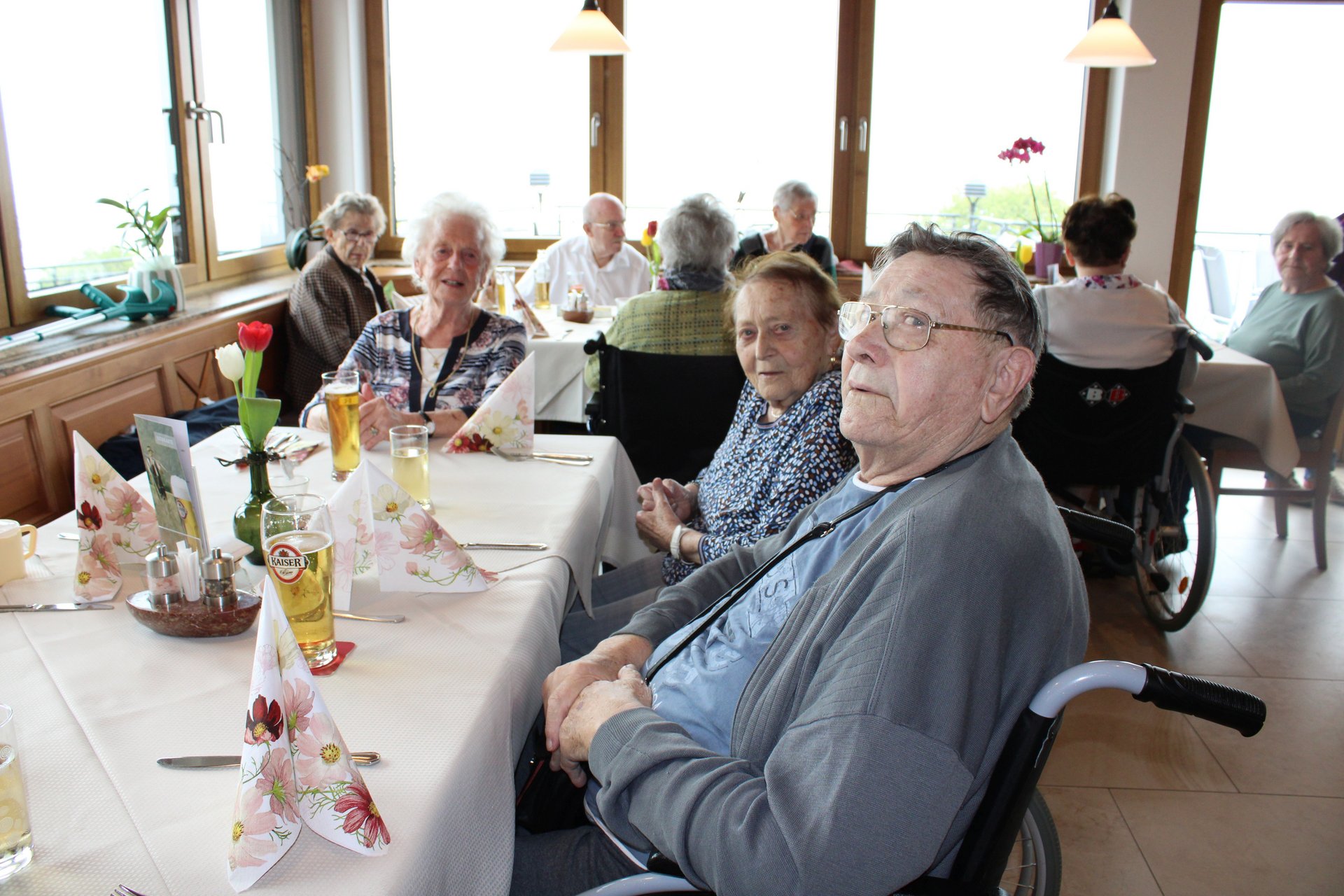 Der diesjährige Frühlingsausflug führte 33 Bewohnerinnen und Bewohner, sowie 7 haupt- und ehrenamtliche Mitarbeiterinnen und Mitarbeiter des NÖ Pflege- und Betreuungszentrums Waidhofen/Ybbs am 10.05.2023 über die hügelige und farbenprächtig blühende Landschaft des Ybbstals. Von Waidhofen/Ybbs über St. Leonhard/Walde kamen wir bald bei der Basilika am Sonntagberg vorbei, weiter ging es auf der gegenüberliegenden Seite von Böhlerwerk über die Wieser Höhe nach St. Michael am Bruckbach. Trotz nicht frühlingshaftem Wetter genossen die Ausflugsgäste die farbenfrohe Landschaft, die noch immer blühenden Obstbäume und die Aussicht auf ihre Heimat entlang der Panoramastraße. Bei vielen Bewohnerinnen und Bewohnern erweckten die Bilder entlang der Strecke Erinnerungen an frühere Zeiten. Die Rast im Gasthof Mitterböck wurde nicht nur zur Stärkung mit köstlichen Speisen genutzt, sondern auch zum Singen und in Erinnerungen schwelgen. Wir erfreuten uns über die musikalische Begleitung durch zwei ehrenamtliche Mitarbeiter, sowie den überraschenden Besuch von Pfarrer aus den Gemeinden St. Michael und Sonntagberg.