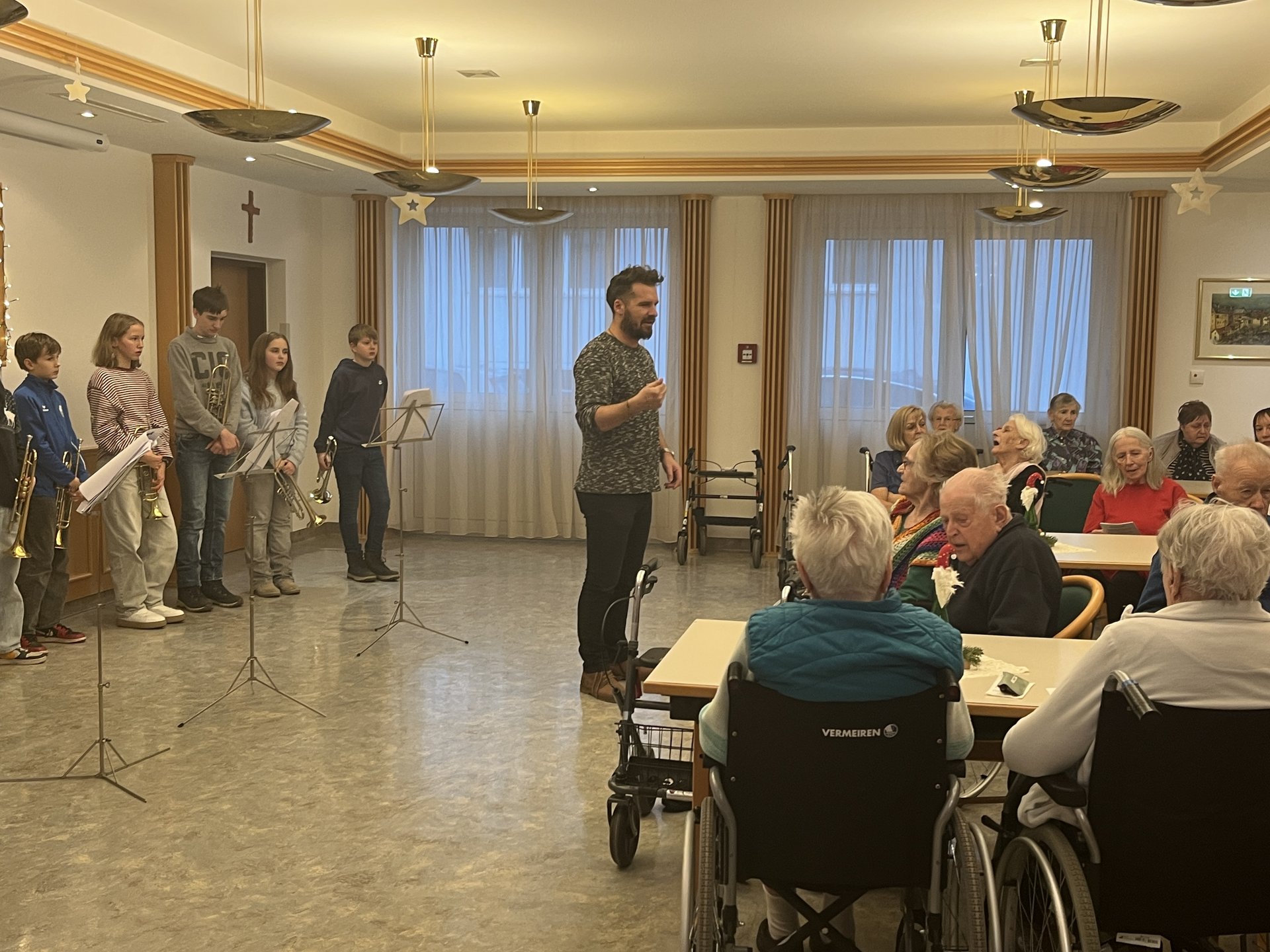 Ein weiteres musikalisches Highlight war einige Tage später auch der bereits traditionelle Besuch der Trompetenklasse der Musikschule Waidhofen/Ybbs unter der Leitung von Robert Kerschbaumer. Altbewährte und bekannte Weihnachtslieder wurden von den Kindern auf den Blasinstrumenten vorgespielt. Die Bewohnerinnen und Bewohner ließen es sich auch hier nicht nehmen und sangen fleißig mit.