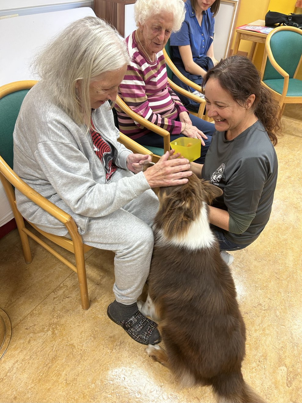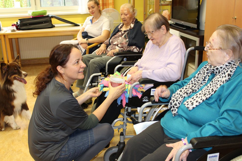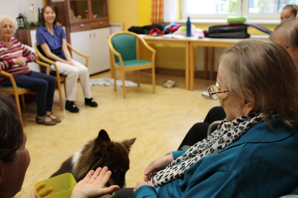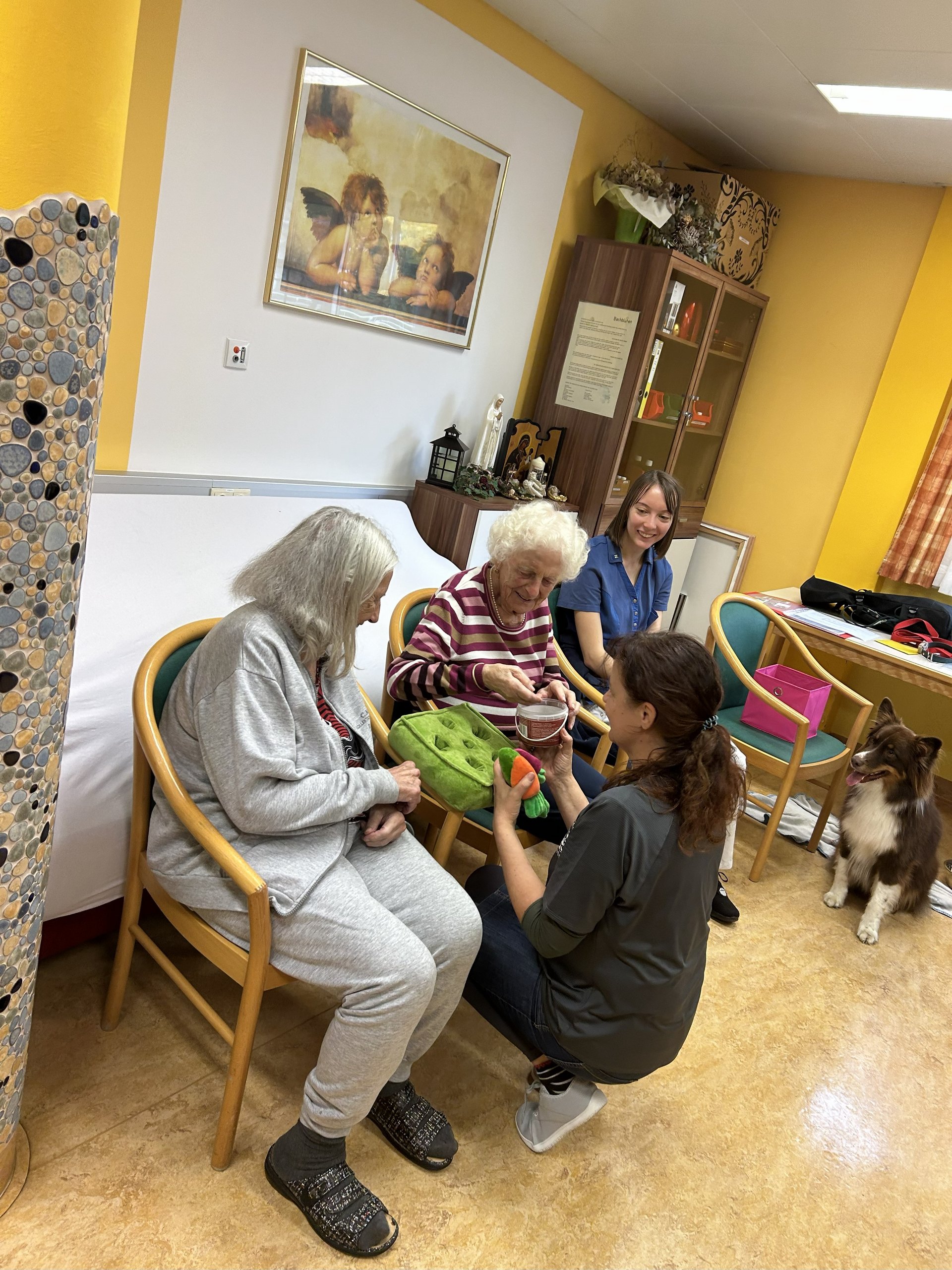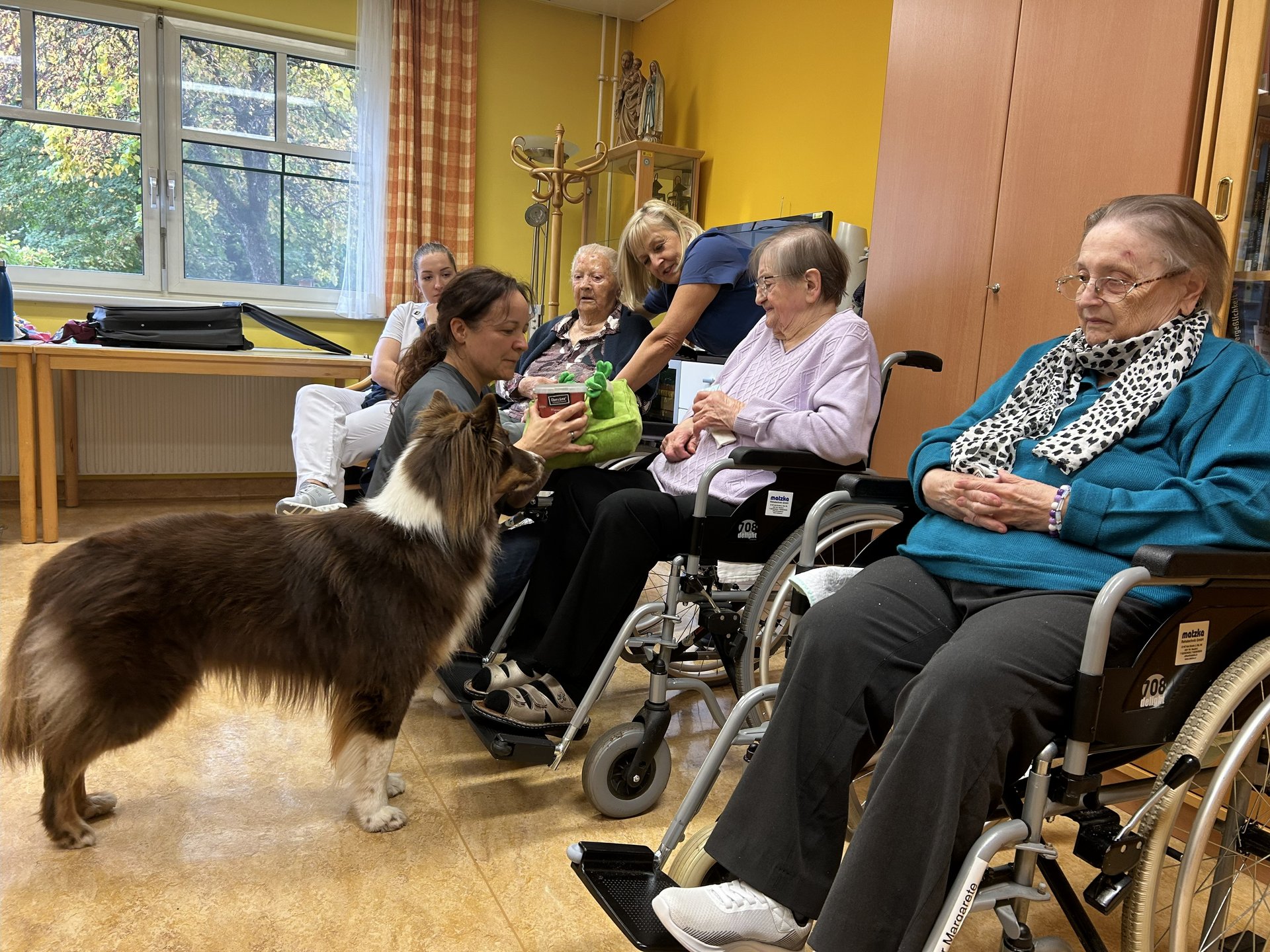 Die erste tiergestützte Therapie mit Therapiehund Milo sorgte für strahlende Gesichter bei unseren Bewohnerinnen und Bewohnern. Im Rahmen des Sommerfests wurde Milo und seine Begleiterin bereits vorgestellt. Umso größer war nun die Freude über den Besuch, bei dem Milo unseren Bewohnerinnen und Bewohnern mit seiner ruhigen und freundlichen Art schöne Momente bescherte.