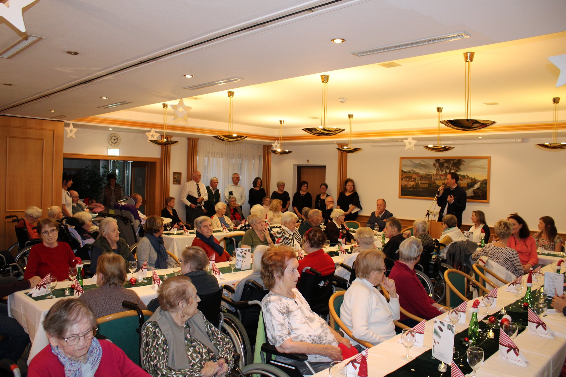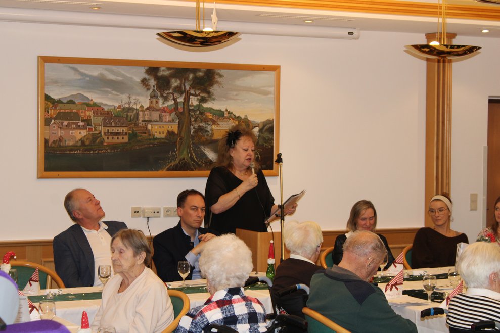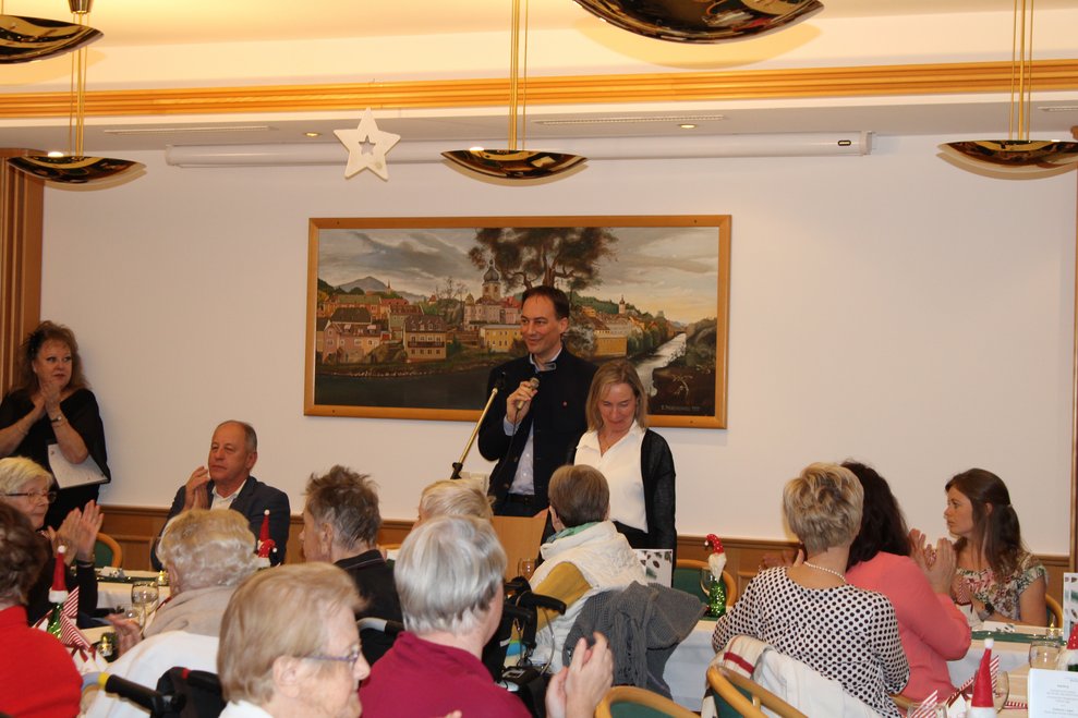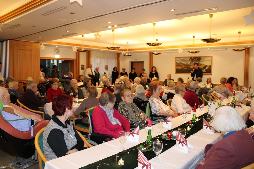 Traditionellerweise steht der Donnerstag vor dem Heiligen Abend im Zeichen der Weihnachtsfeier für Bewohnerinnen und Bewohner des PBZ Waidhofen/Ybbs. Im bis auf den letzten Platz gefüllten Saal begrüßten der kaufmännische Direktor Martin Kaiser und Pflegedirektorin (interim.) Stefanie Luger die Bewohnerinnen und Bewohner, ehren- und hauptamtliche Mitarbeiterinnen und Mitarbeiter des PBZ sowie die geladenen Ehrengäste.