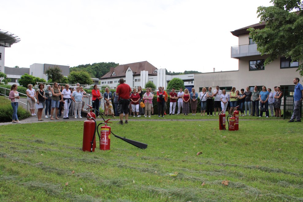 Bei der jährlichen Brandschutzunterweisung üben die Mitarbeiterinnen und Mitarbeiter des PBZ Waidhofen/Ybbs für den Ernstfall. Besonders wichtig dabei ist, den Feuerlöscher und die Löschdecke im Rahmen der Übung selbst in die Hand zu nehmen, um im Notfall erste Maßnahmen rasch einleiten zu können.