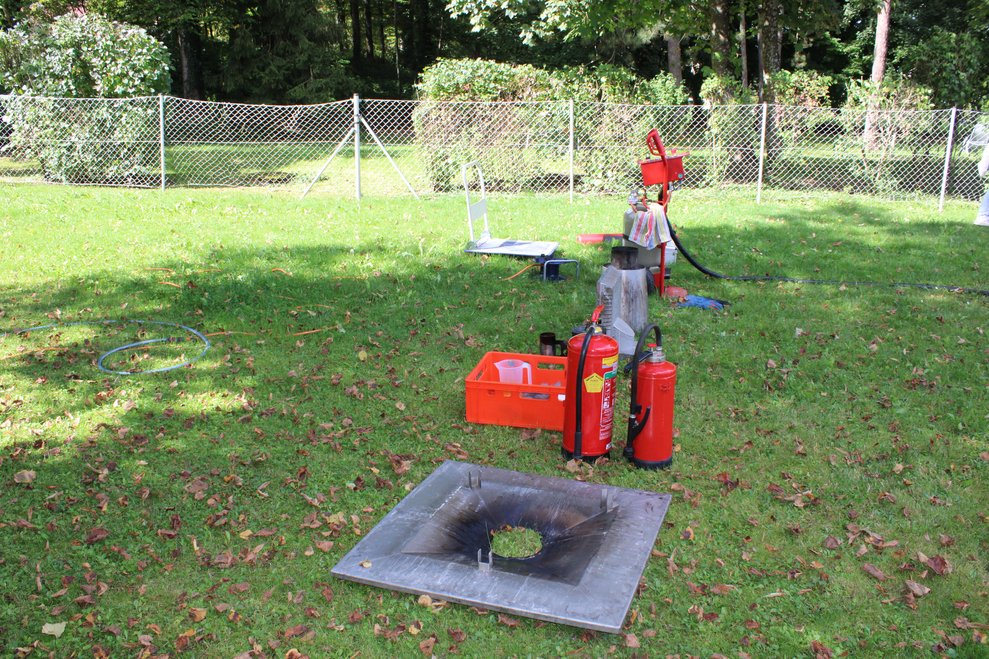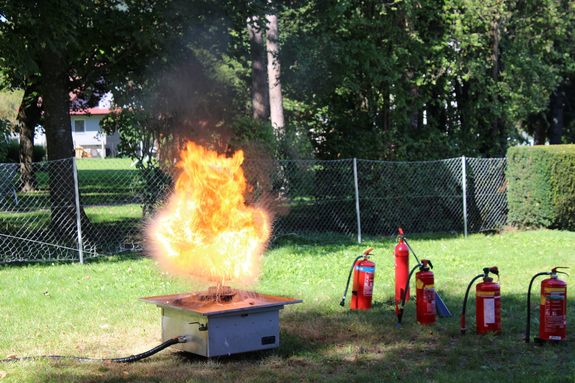 Beim ersten Teil der Übung wird über die verschiedenen Arten von Feuerlöschern und ihre gezielten Einsatzmöglichkeiten informiert, sowie der Umgang mit Feuerlöscher und Löschdecke praktisch geübt.